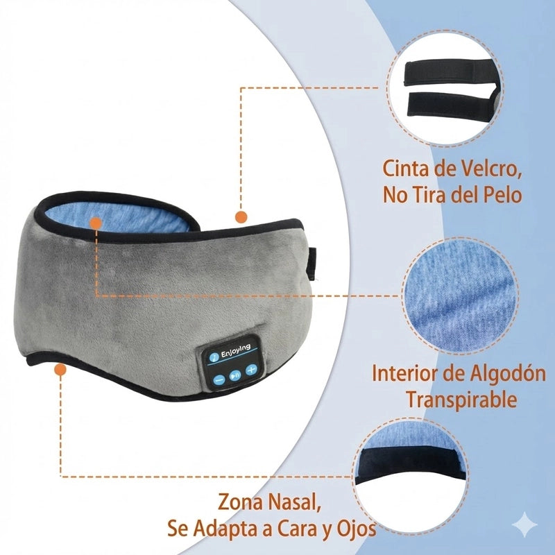 Es ultra suave, ajustable y tan ligera que olvidarás que la llevas puesta. Bloquea la luz, te envuelve en sonido y te garantiza un sueño profundo, estés donde estés.